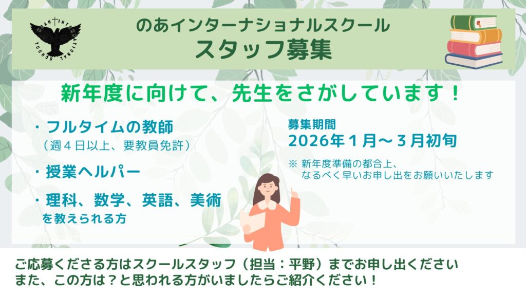 のあインターナショナルスクールでは、新年度に向けて先生を募集しています。