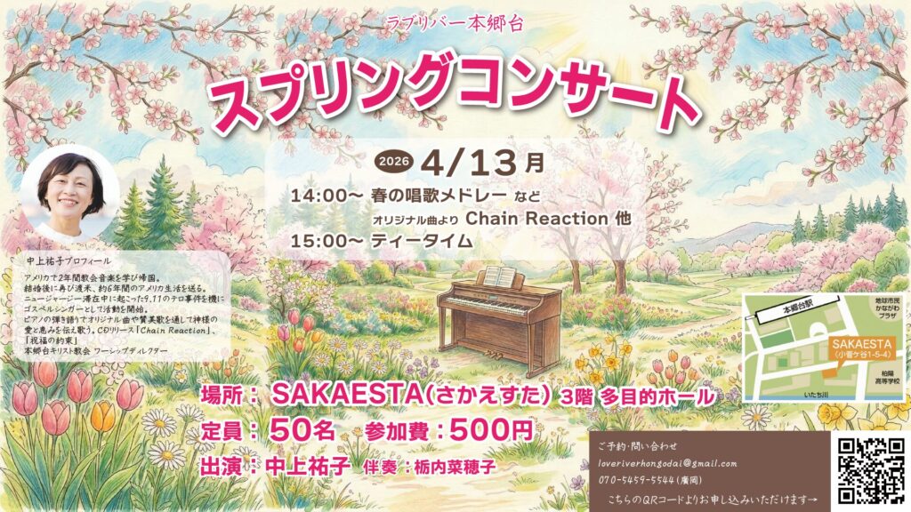 本郷台駅前の「さかえすた」にて、ラブリバー主催のスプリングコンサートを開催いたします。皆様お誘い合わせの上ご参加ください。