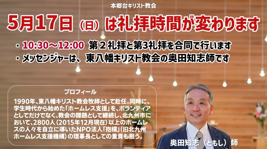 【重要】5月17日 奥田知志師をお迎えしての第2、第3合同礼拝は10:30から